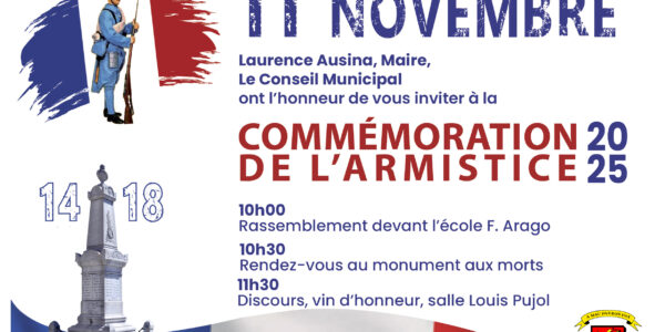 COMMÉMORATION DE L’ARMISTICE DU 11 NOVEMBRE 1918 PROGRAMME Lundi 11 novembre 2025Programme 10h00 – Rassemblement devant l’école François Arago et dépôt de gerbe 10h30 – Cérémonie et dépôt de gerbe au Monument aux Morts 11h30 – Discours suivi d’un apéritif…