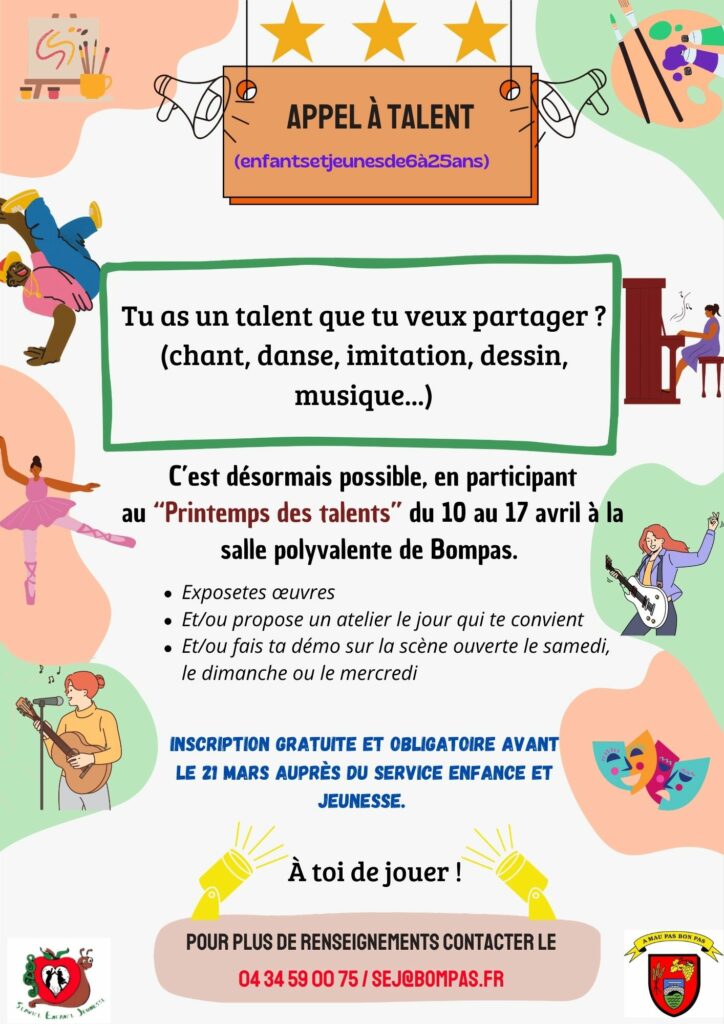 Tu as un talent que tu veux partager ? (chant, danse, imitation, dessin, musique…). C’est désormais possible, en participant au “Printemps des talents” du 10 au 17 avril à la salle polyvalente de Bompas. Inscription Gratuite et obligatoire avant le 21 Mars auprès du Service enfance et jeunesse. Inscription Gratuite et obligatoire avant le 21 Mars auprès du Service enfance et jeunesse. Pour plus de renseignements contacter le 04 34 59 00 75 / sej@bompas.fr